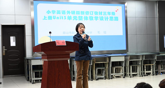 毛绘老师带来专题讲座 ——《小学英语外研版新修订教材三年级上册 Unit 3 单元整体教学设计思路》。
