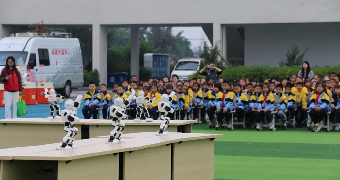 机器人舞蹈队的登场,更是让现场热度飙升!机械臂灵活摆动、关节精准卡点,跟着动感节拍跳出整齐又酷炫的舞蹈,满是机械美学的舞姿,仿佛一群从未来穿越而来的“舞蹈家”。孩子们看得目不转睛,有的忍不住跟着节拍跺脚,有的拉着身边同学的手激动地说:“机器人跳得也太帅了吧!”
