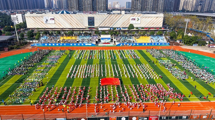 团体表演将开幕式推向高潮。四年级1-9班的500余名同学带来了大型团体操《东坡少年志·活力展新篇》,他们用舒展的队形演绎诗词意境,用跃动的姿态彰显体育精神。紧接着,四年级10-18班的同学们手持猎猎红旗,以一场气势恢宏的《精忠报国》表演,展现了东坡少年的家国情怀。随后,动感十足的街舞《逆风舞动》引爆全场,展示了少年们的蓬勃朝气与现代活力。