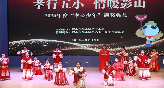 春风沐校园,孝德润童心。为深入落实立德树人根本任务,厚植学生孝老爱亲的传统美德,践行社会主义核心价值观,眉山市彭山区第五小学隆重举行 2025年度 “孝心少年” 表彰仪式。市、区关工委领导、师生代表及家长代表齐聚一堂,共赴这场浸润孝德的成长之约,见证五小学子以孝立身、向阳生长的荣耀时刻。