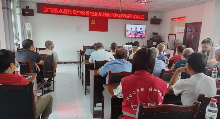9月3日,宝飞镇水晶村村委组织村干部、网格员、社长、党员退役军人等,在村办公室集中收看了纪念中国人民抗日战争暨世界反法西斯战争胜利80周年大会。