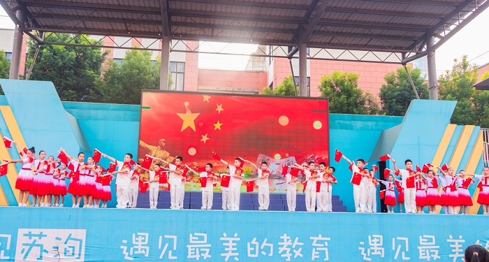 与此同时,苏洵小学的升旗仪式在晨曦中隆重举行。活动由三年级九中队主持,全校师生面向国旗肃立,高唱国歌,注视五星红旗冉冉升起。在宣誓环节中,同学们举起右手,庄严承诺争做全面发展的“洵美少年”。随后,三九中队表演了舞蹈《在灿烂的阳光下》,以灵动舞姿表达对和平生活的热爱;并通过话剧《勿忘国耻,吾辈自强》,深情演绎了中华民族在危难时刻表现出的勇气与不屈。