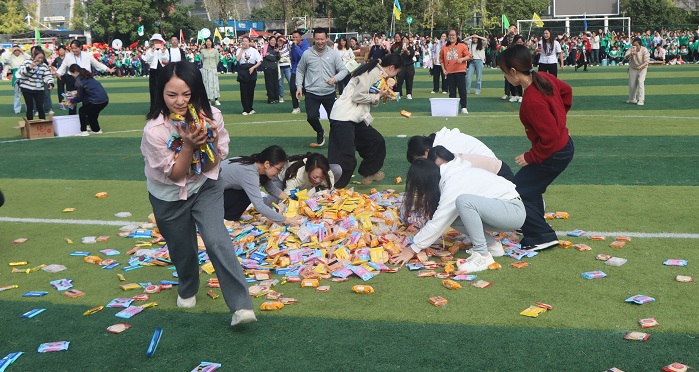 本届体育节特别增设的“班主任零食大作战”趣味挑战,成为一道独特的风景线。全校88位班主任化身班级的“冲锋代表”,为了孩子们的“零食福利”全力投入。他们或快速抓取,或巧妙策略,引得现场笑声、加油声不断。这项活动不仅拉近了师生距离,更让整个校园沉浸在活泼热烈、温情满满的欢乐氛围中。