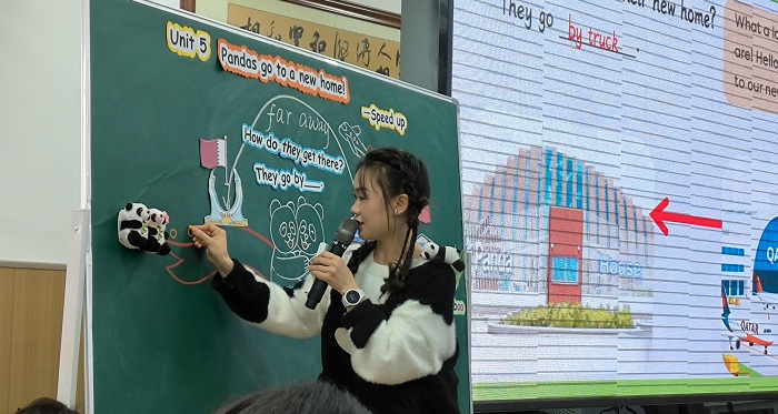 课堂上,唐老师以儿歌、卡通动画、表演点燃学习热情,将单词、句型融入熊猫迁居情境,通过小组合作、角色扮演、创编对话等多样活动,既夯实语言基础,又培养合作意识与创新思维。