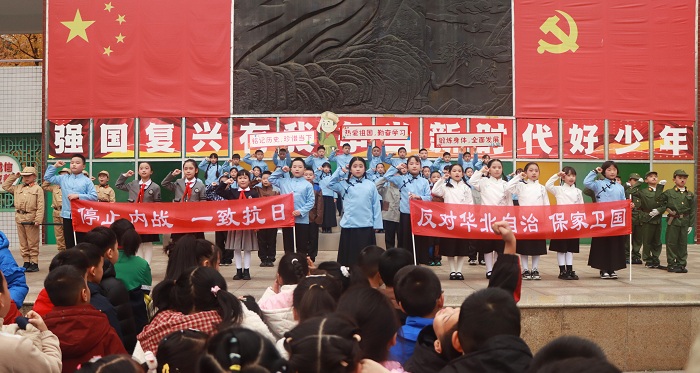 活动以“新闻播报+情景演绎”形式展开,主播以“跨越时空栏目”引入1935年华北背景,“前线记者”现场报道、学生分别饰演日军、民众、爱国学子等角色,生动还原了日军妄图侵占华北、国民政府妥协打压民众,以及北平学生高呼“停止内战,一致抗日”游行示威的历史场景。