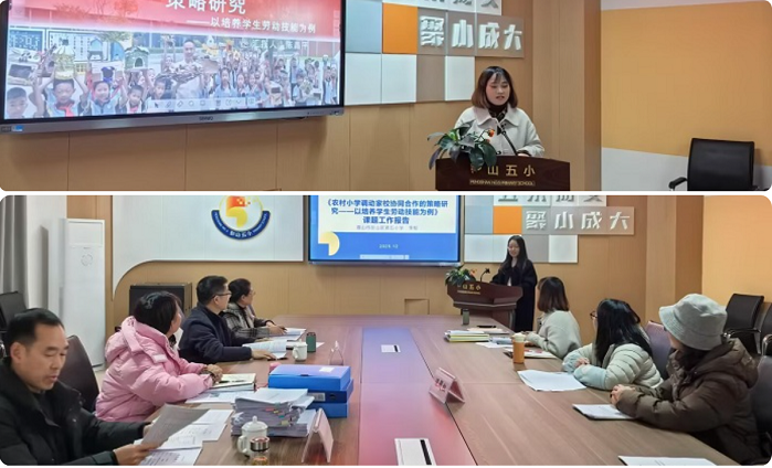 下午,彭山五小《家校协同的策略研究——以培养学生劳动技能为例》课题,由李郁老师从家校协同机制的搭建过程方面作工作报告,陈昌平老师以亲子劳动实践案例为核心汇报研究成效。