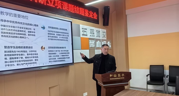 上午,彭山一小《“双减”背景下分数助推小学书法教学质量提升策略研究》课题,由葛利萍老师从研究过程与实施保障方面作工作报告,刘立恒老师围绕书法教学提质的具体策略与实践成效作研究报告。