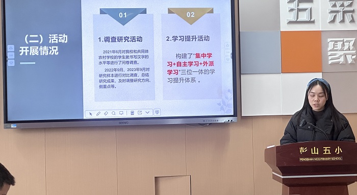 彭山五小《提高小学生汉字书写水平的策略研究》课题,由郭学梅老师以课题研究的推进步骤与资料积累情况作工作报告,刘立恒老师则聚焦农村学生书写习惯培养与分层教学模式分享研究成果。